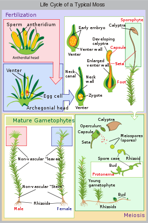 Mosses can be either dioicous (compare with dioecious in seed plants) or monoicous (compare monoecious). In dioicous mosses, both male and female sex organs are borne on different gametophyte plants. In monoicous (also called autoicous) mosses, they are borne on the same plant. In the presence of water, sperm from the antheridia swim to the archegonia and fertilization occurs, leading to the production of a diploid sporophyte. The sperm of mosses is biflagellate, i.e. they have two flagella that aid in propulsion. Without water, fertilization cannot occur. After fertilization, the immature sporophyte pushes its way out of the archegonial venter. It takes about a quarter to half a year for the sporophyte to mature. The sporophyte body comprises a long stalk, called a seta, and a capsule capped by a cap called the operculum. The capsule and operculum are in turn sheathed by a haploid calyptra which is the remains of the archegonial venter. The calyptra usually falls off when the capsule is mature. Within the capsule, spore-producing cells undergo meiosis to form haploid spores, upon which the cycle can start again. The mouth of the capsule is usually ringed by a set of teeth called peristome. This may be absent in some mosses.