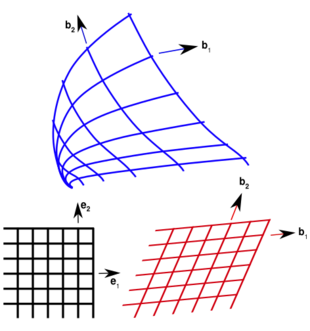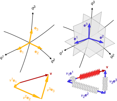 More generally, we can define basis vectors bi so that they depend on q = (q1, q2,...,qn), i.e. they change from point to point: bi = bi(q). In which case to define the same point x in terms of this alternative basis: the coordinates with respect to this basis vi also necessarily depend on x also, that is vi = vi(x). Then a vector v in this space, with respect to these alternative coordinates and basis vectors, can be expanded as a linear combination in this basis (which simply means to multiply each basis vector ei by a number vi – scalar multiplication):