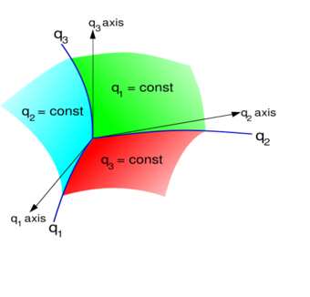 The surfaces q1 = constant, q2 = constant, q3 = constant are called the coordinate surfaces; and the space curves formed by their intersection in pairs are called the coordinate curves. The coordinate axes are determined by the tangents to the coordinate curves at the intersection of three surfaces. They are not in general fixed directions in space, which happens to be the case for simple Cartesian coordinates, and thus there is generally no natural global basis for curvilinear coordinates.