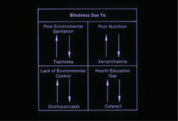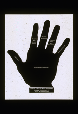 For example, in villages with endemic trachoma the eye care health workers would educate families about the importance of sanitation and handwashing and also provide access to eye drops. In areas with high rates of blindness due to cataract this cadre of personnel would educate families about the cure for blindness due to cataracts with eye surgery. Changing the belief that blindness is an inevitable consequence of aging requires community eye health education about curable blindness and preventable blindness which is still so necessary in many parts of the world. Community ophthalmology teachings include the concept of primary eye care which has been advocated as both as a stand-alone health service as well as a new integral component of basic health services or public health services.[4]