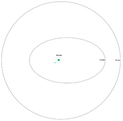 Hiʻiaka orbits Haumea nearly circularly every 49 days.[9] Namaka orbits Haumea in 18 days in a moderately elliptical, non-Keplerian orbit, and as of 2008 was inclined 13° with respect to Hiʻiaka, which perturbs its orbit.[4] Because the impact that created the moons of Haumea is thought to have occurred in the early history of the Solar System,[13] over the following billions of years it should have been tidally damped into a more circular orbit. Namaka's orbit has likely been disturbed by orbital resonances with the more-massive Hiʻiaka due to converging orbits as they moved outward from Haumea due to tidal dissipation.[4] They may have been caught in and then escaped from orbital resonance several times; they currently are in or at least close to an 8:3 resonance.[4] This resonance strongly perturbs Namaka's orbit, which has a current precession of its argument of periapsis by about −6.5° per year, a precession period of 55 years.[8]