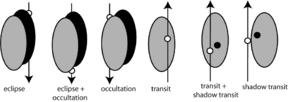At present, the orbits of the Haumean moons appear almost exactly edge-on from Earth, with Namaka having periodically occulted Haumea from 2009 to 2011.[14][15] Observation of such transits would provide precise information on the size and shape of Haumea and its moons, as happened in the late 1980s with Pluto and Charon.[16] The tiny change in brightness of the system during these occultations required at least a medium-aperture professional telescope for detection.[17] Hiʻiaka last occulted Haumea in 1999, a few years before its discovery, and will not do so again for some 130 years.[18] However, in a situation unique among regular satellites, the great torquing of Namaka's orbit by Hiʻiaka preserved the viewing angle of Namaka–Haumea transits for several more years.[4][17]