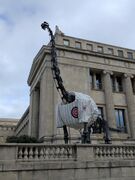 Model Brachiosaurus skeleton wearing Chicago Cubs uniform in museum courtyard