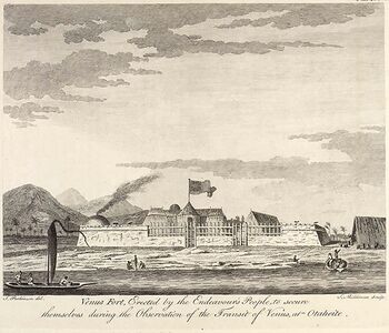 Once the Endeavour arrived on the island, Cook decided to set up the Venus transit observatory on shore. He required a completely stable platform which the ship could not provide and plenty of space to work with. The location of the observatory would be known as "Fort Venus." A sandy spit on the northeast end of Matavai Bay, named Point Venus by Cook, was chosen for the site.[13] They began building Fort Venus two days after they arrived. They marked a perimeter and construction began. It had earthworks on three of its sides adjacent to deep channels. Wood was gathered to construct palisades that topped the earthworks. Casks from the ship were filled with wet sand and used for stability. The east side of the fort faced the river. Mounted guns were brought in from the ship. A gateway was assembled and within this fortification, fifty-four tents were pitched which housed the crew, scientists, and officers as well as the observatory, blacksmith equipment and a kitchen.[14] Cook sent a party led by Zachary Hickes to a point on the east coast of the island for additional observations. John Gore led another group of thirty-eight more on a neighboring island of Eimeo (Moorea). Both parties were briefed and supplied with the needed equipment.[11]
