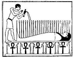 Plutarch and others have noted that the sacrifices to Osiris were "gloomy, solemn, and mournful..." (Isis and Osiris, 69) and that the great mystery festival, celebrated in two phases, began at Abydos commemorating the death of the god, on the same day that grain was planted in the ground (Isis and Osiris, 13). The annual festival involved the construction of "Osiris Beds" formed in shape of Osiris, filled with soil and sown with seed.[41] The germinating seed symbolized Osiris rising from the dead. An almost pristine example was found in the tomb of Tutankhamun.[42] The imiut emblem- an image of a stuffed, headless skin of an animal tied to a pole mounting a pot, was a symbol associated both with Osiris as god of the underworld and with Anubis, god of mummification, was sometimes included among a deceased person's funerary equipment.[13]