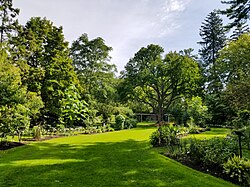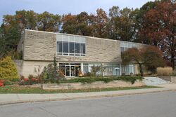 The oldest part of campus lies on the Red Cedar river's north bank.[91] It includes Collegiate Gothic architecture, plentiful trees, and curving roads with few straight lines. The college built its first three buildings here, of which none survive. Other historic buildings north of the river include the president's official residence, Cowles House; and Beaumont Tower, a carillon clock tower marking the site of College Hall, the original classroom building. To the east lies Eustace–Cole Hall, America's first freestanding horticulture laboratory.[92] Other landmarks include the bronze statue of former president John A. Hannah,[93] the W. J. Beal Botanical Garden, and the painted boulder known as "The Rock", a popular spot for theater, tailgating, and candlelight vigils. On the campus's northwest corner is the university's hotel, the Kellogg Hotel and Conference Center. The university also has two museums. MSU Museum, initiated in 1857, is one of the Midwest's oldest museums and is accredited by the American Alliance of Museums.[94] The Eli and Edythe Broad Art Museum, designed by Zaha Hadid, opened in 2012 as MSU's primary art gallery, and features art from MSU's permanent collection as well as from graduate students on campus.[95]