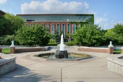 The campus south of the river consists mostly of post-World War II International Style buildings, and is characterized by sparser foliage, relatively straight roadways, and many parking lots. The "2020 Vision" Master Plan proposes replacing these parking lots with parking ramps and green space,[96] but these plans will take many years to reach fruition. As part of the master plan, the university erected a new bronze statue of The Spartan in 2005 to be placed at the intersection of Chestnut and Kalamazoo, just south of the Red Cedar River. This replica replaced the original modernist terra cotta statue,[97] which can still be seen inside Spartan Stadium. Notable academic and research buildings on the South Campus include the Cyclotron, the College of Law, the Facility for Rare Isotope Beams (FRIB), Interdisciplinary Science and Technology Building,[98] and the Broad College of Business.[99]