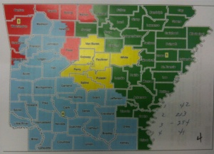 Northwestern Arkansas, a heavily white area, lost some legislative representation to the Eastern region, in keeping with an order to increase minority representation. By early autumn, a final map was circulated for approval. Five seats, four in the House and one in the Senate, paired incumbents against one another.