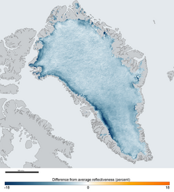 The tens of thousands of hectares of greenhouses in Almería, Spain form a large expanse of whitened plastic roofs. A 2008 study found that this anthropogenic change lowered the local surface area temperature of the high-albedo area, although changes were localized.[25] A follow-up study found that "CO2-eq. emissions associated to changes in surface albedo are a consequence of land transformation" and can reduce surface temperature increases associated with climate change.[26]