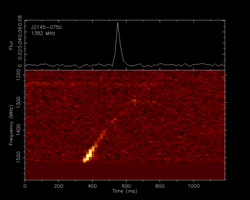 - ↑ Saint-Hilaire, P.; Benz, A. O.; Monstein, C. (2014). "Short-duration Radio Bursts with Apparent Extragalactic Dispersion". The Astrophysical Journal 795 (1): 19. doi:10.1088/0004-637X/795/1/19. Bibcode: 2014ApJ...795...19S.