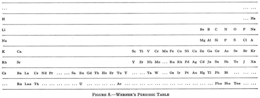 The quantum theory clarified the transition metals and lanthanides as forming their own separate groups, transitional between the main groups, although some chemists had already proposed tables showing them this way before then: the English chemist Henry Bassett did so in 1892, the Danish chemist Julius Thomsen in 1895, and the Swiss chemist Alfred Werner in 1905. Bohr used Thomsen's form in his 1922 Nobel Lecture; Werner's form is very similar to the modern 32-column form. In particular, this supplanted Brauner's asteroidal hypothesis.[14]