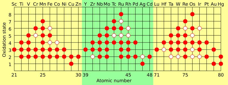 For transition metals, common oxidation states are nearly always at least +2 for similar reasons (uncovering the next subshell); this holds even for the metals with anomalous dx+1s1 or dx+2s0 configurations (except for silver), because repulsion between d-electrons means that the movement of the second electron from the s- to the d-subshell does not appreciably change its ionisation energy.[141] Because ionising the transition metals further does not uncover any new inner subshells, their oxidation states tend to vary by steps of 1 instead.[139] The lanthanides and late actinides generally show a stable +3 oxidation state, removing the outer s-electrons and then (usually) one electron from the (n−2)f-orbitals, that are similar in energy to ns.[142] The common and maximum oxidation states of the d- and f-block elements tend to depend on the ionisation energies. As the energy difference between the (n−1)d and ns orbitals rises along each transition series, it becomes less energetically favourable to ionise further electrons. Thus, the early transition metal groups tend to prefer higher oxidation states, but the +2 oxidation state becomes more stable for the late transition metal groups. The highest formal oxidation state thus increases from +3 at the beginning of each d-block row, to +7 or +8 in the middle (e.g. OsO4), and then decrease to +2 at the end.[141] The lanthanides and late actinides usually have high fourth ionisation energies and hence rarely surpass the +3 oxidation state, whereas early actinides have low fourth ionisation energies and so for example neptunium and plutonium can reach +7.[111][141][142] The very last actinides go further than the lanthanides towards low oxidation states: mendelevium is more easily reduced to the +2 state than thulium or even europium, and nobelium outright favours +2 over +3, in contrast to ytterbium.[49]