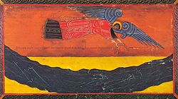 A woman gives birth to a son who is to "rule the nations with an iron scepter". She is then pursued by a Dragon with seven heads and ten horns, which wants to kill her baby. However, the child was taken away by God. Immediately after this, Michael and his angels fought the Dragon and his followers in Heaven. The Dragon lost the war, and was thrown down to Earth along with all of its followers. The Dragon pursued the woman and tried to drown her, but the water drained away into the ground. The woman grew wings and flew away. The Dragon was enraged, and went to war with the remainder of her offspring, who keep the commandments of God.