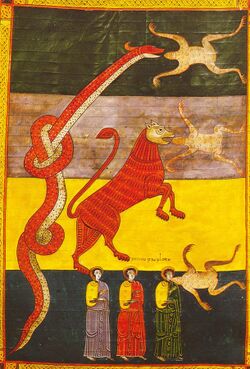 ↑For illuminated medieval images of the Book of Revelation drawn from several of the Beatus commentaries, the Bamberg Apocalypse and from the Otthenreich Bible, see: Forbes, Andrew; Henley, David (2012). Apocalypse: The Illustrated Book of Revelation. Chiang Mai: Cognoscenti Books. ASIN: B008WAK9SS.