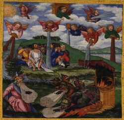 Satan is bound in the Abyss for a thousand years. The Saints who died are resurrected (Resurrection of the Saints[6]) and begin their thousand-year reign with Christ (Revelation 20:1-6). After the thousand years, Satan is released from the Abyss to deceive the nations and gather Gog and Magog and the people of the world to encircle the camp of the saints and the city of Jerusalem. A fire comes down from God out of heaven and devours them and Satan is finally placed in torment, in the Lake of Fire, forever, with those who follow him (Revelation 20:7-10). The wicked dead and all of those who died during the thousand-year reign of Christ are resurrected and judged (Revelation 20:11-14).