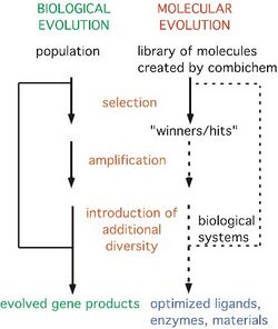 Combinatorial biology techniques generally begin with large numbers of peptides, which are generated and screened by physically linking a gene encoding a protein and a copy of said protein. This could involve the protein being fused to the M13 minor coat protein pIII, with the gene encoding this protein being held within the phage particle. Large libraries of phages with different proteins on their surfaces can then be screened through automated selection and amplification for a protein that binds tightly to a particular target.[3]