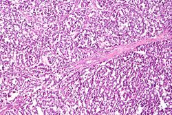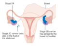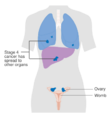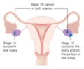 Ovarian cancer is a cancerous tumor of an ovary.[10] It may originate from the ovary itself or more commonly from communicating nearby structures such as fallopian tubes or the inner lining of the abdomen.[3][11] The ovary is made up of three different cell types including epithelial cells, germ cells, and stromal cells.[12] When these cells become abnormal, they have the ability to divide and form tumors. These cells can also invade or spread to other parts of the body.[13] When this process begins, there may be no or only vague symptoms.[1] Symptoms become more noticeable as the cancer progresses.[1][14] These symptoms may include bloating, vaginal bleeding, pelvic pain, abdominal swelling, constipation, and loss of appetite, among others.[1] Common areas to which the cancer may spread include the lining of the abdomen, lymph nodes, lungs, and liver.[15]