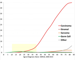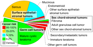 The risks from developing specific types of ovarian cancer varies. Germ cell tumors and sex cord-stromal tumors are less common than epithelial tumors. The number of new cases a year in the US is 0.4 per 100,000 women and 0.2 per 100,000 women, respectively. In young people, sex-cord stromal tumors and germ cell tumors total 1% of overall ovarian cancer.[33] Ovarian cancer represents approximately 4% of cancers diagnosed in women.[31]