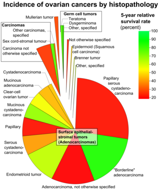 The survival rates given below are for the different types of ovarian cancer, according to American Cancer Society.[121] They come from the National Cancer Institute, SEER, and are based on patients diagnosed from 2004 to 2010.