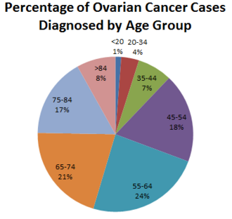 In the US, the incidence rate in women over 50 is approximately 33 per 100,000.[135] The rate of ovarian cancer between 1993 and 2008 decreased in women of the 40–49 age cohort and in the 50–64 age cohort.[28] Ovarian cancer is most commonly diagnosed after menopause,[35] between the ages of 60 and 64. Ninety percent of ovarian cancer occurs in women over the age of 45 and 80% in women over 50.[31] Older women are more likely to present with advanced ovarian cancer.[20]