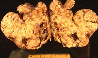 Malignant germ cell tumors are the type of ovarian cancer most likely to occur during pregnancy. They are typically diagnosed when an adnexal mass is found on examination (in 1–2% of all pregnancies), a tumor is seen on ultrasound, or the parent's level of alpha-fetoprotein is elevated. Dermoid cysts and dysgerminomas are the most common germ cell tumors during pregnancy. Germ cell tumors diagnosed during pregnancy are unlikely to have metastasized and can be treated by surgery and, in some cases, chemotherapy, which carries the risk of birth defects. Yolk sac tumors and immature teratomas grow particularly quickly and are usually treated with chemotherapy even during pregnancy; however, dysgerminomas that have been optimally debulked may be treated after childbirth.[33]
