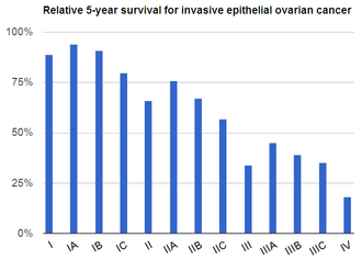 Screening is not recommended in women who are at average risk, as evidence does not support a reduction in death and the high rate of false positive tests may lead to unneeded surgery, which is accompanied by its own risks.[19] Those at very high risk may have their ovaries removed as a preventive measure.[4] If caught and treated in an early stage, ovarian cancer is often curable.[1] Treatment usually includes some combination of surgery, radiation therapy, and chemotherapy.[1] Outcomes depend on the extent of the disease, the subtype of cancer present, and other medical conditions.[5][20] The overall five-year survival rate in the United States is 49%.[7] Outcomes are worse in the developing world.[5]