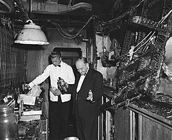 In Rotterdam on October 21, 1957, fire damaged part of Nieuw Amsterdam near her stern. The fire was put out, and she was withdrawn from service until December 9.[117] She was repaired, and on December 20 left Hoboken with 750 passengers for a 16-day Caribbean cruise.[118] She was scheduled to continue cruising until the end of March 1958.[119] On January 2, 1958 the ship was in Havana in a gale and heavy rain. A barge moored to her was torn from its moorings. Havana harbor police rescued two passengers, but a seaman was reported missing.[120]