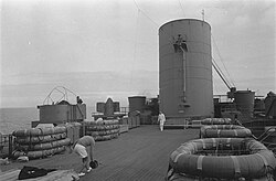 On September 7, 1940 Nieuw Amsterdam was dry docked for her annual inspection and overhaul.[58] On September 11 she left New York, and from September 14 to October 11 she was in Halifax, Nova Scotia.[59]