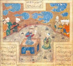 Mani is described as a painter who set up a sectarian movement in opposition to Zoroastrianism. He was persecuted by Shapur I and fled to Central Asia, where he made disciples and embellished with paintings a Tchighil (or picturarum domus Chinensis) and another temple called Ghalbita. Provisioning in advance a cave which had a spring, he told his disciples he was going to heaven, and would not return for a year, after which time they were to seek him in the cave in question. They then came back there after a year and found him, whereupon he showed them an illustrated book, called Ergenk, or Estenk Arzhang, which he said he had brought from heaven.[39]