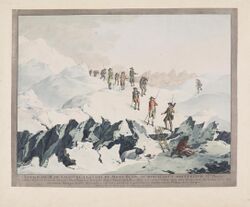 Conrad Gessner was the first naturalist to ascend the mountains in the 16th century, to study them, writing that in the mountains he found the "theatre of the Lord".[133] By the 19th century more naturalists began to arrive to explore, study and conquer the high peaks.[134] Two men who first explored the regions of ice and snow were Horace-Bénédict de Saussure (1740–1799) in the Pennine Alps,[135] and the Benedictine monk of Disentis Placidus a Spescha (1752–1833).[134] Born in Geneva, Saussure was enamoured with the mountains from an early age; he left a law career to become a naturalist and spent many years trekking through the Bernese Oberland, the Savoy, the Piedmont and Valais, studying the glaciers and geology, as he became an early proponent of the theory of rock upheaval.[136] Saussure, in 1787, was a member of the third ascent of Mont Blanc—today the summits of all the peaks have been climbed.[35]