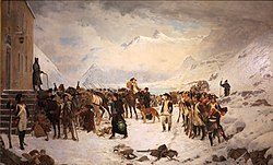 During the Napoleonic Wars in the late 18th century and early 19th century, Napoleon annexed territory formerly controlled by the House of Habsburg, and the House of Savoy. In 1798, the Helvetic Republic was established, two years later an army across the Great St Bernard Pass.[121] In 1799 the Russian imperial military engaged the revolutionary French army in the Alps, this episode has been recorded as significant achievement in mountain warfare.[122] In October 1799 the troops commanded by Alexander Suvorov were surrounded in the Alps by much larger French troops. The Russian troops broke out, mauled the French troops, and retreated through the Panix Pass.[123]