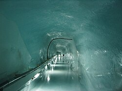 Agassiz studied glacier movement in the 1840s at the Unteraar Glacier where he found the glacier moved 100 m (328 ft) per year, more rapidly in the middle than at the edges. His work was continued by other scientists and now a permanent laboratory exists inside a glacier under the Jungfraujoch, devoted exclusively to the study of Alpine glaciers.[55]