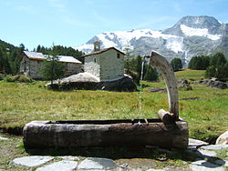 Roofs are traditionally constructed from Alpine rocks such as pieces of schist, gneiss, or slate.[157] Such chalets are typically found in the higher parts of the valleys, as in the Maurienne valley in Savoy, where the amount of snow during the cold months is important. The inclination of the roof cannot exceed 40%, allowing the snow to stay on top, thereby functioning as insulation from the cold.[158] In the lower areas where the forests are widespread, wooden tiles are traditionally used. Commonly made of Norway spruce, they are called "tavaillon".