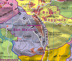 It is the third largest city in the country, after Dogana and Borgo Maggiore. It borders the San Marino municipalities Acquaviva, Borgo Maggiore, Fiorentino, and Chiesanuova and the Italian municipality San Leo.