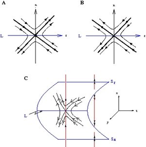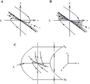 In geometric terms a canard solution corresponds to the intersection of an attracting and repelling slow manifold \(S_{a,\varepsilon}\cap S_{r,\varepsilon}\) near a non-hyperbolic point \(p\in L\ .\) This geometric object is called a maximal canard.