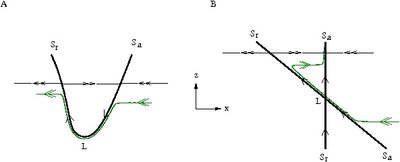 Definition: A canard is a solution of a singularly perturbed system which follows an attracting slow manifold \(S_a\ ,\) passes close to a bifurcation point \(p\in L\) of the critical manifold, and then follows a repelling slow manifold \(S_r\) for a considerable amount of time.