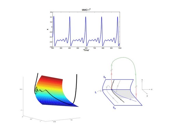 MMOs correspond to switching between small amplitude oscillations and relaxation oscillations. These patterns were first discovered in the famous Belousov-Zhabotinsky reaction and, since then, have been frequently observed in experiments and models of chemical and biological rhythms. One way to explain these patterns is based on canards of folded node type. The reason is that canards of folded node type can be responsible for small amplitude oscillations (Wechselberger [2005]). A good intuition for MMOs is that a system moves dynamically from a small amplitude oscillatory state to a relaxation oscillatory state and the feature of the large relaxation oscillation is to bring the system back to the basin of attraction of the small amplitude oscillatory state. Other proposed mechanisms for MMOs are break-up/loss of stability of a Shilnikov homoclinic orbit (Koper [1995]), break-up of an invariant torus (Larter and Steinmetz [1991]) or slow passage through a delayed Hopf bifurcation (Larter et al. [1988]).