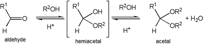 Formation of an acetal occurs when the hydroxyl group of a hemiacetal becomes protonated and is lost as water. The carbocation that is produced is then rapidly attacked by a molecule of alcohol. Loss of the proton from the attached alcohol gives the acetal.