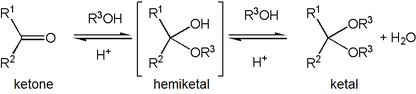 The term ketal is sometimes used to identify structures associated with ketones (both R groups organic fragments rather than hydrogen) rather than aldehydes and, historically, the term acetal was used specifically for the aldehyde-related cases (having at least one hydrogen in place of an R on the central carbon).[1] The IUPAC originally deprecated the usage of the word ketal altogether, but has since reversed its decision.[citation needed] However, in contrast to historical usage, ketals are now a subset of acetals, a term that now encompasses both aldehyde- and ketone-derived structures.[citation needed]