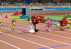 Wii Sports opened the way for other physically reactive sports-based video games, such as Mario & Sonic at the Olympic Games, the first official title to feature both Mario and Sonic the Hedgehog, in which players used the Wii Remote to simulate running, jumping and other Olympic sports.[98] In 2008, Nintendo released Wii Fit, which allowed players to do aerobic and fitness exercises using the Wii Balance Board.[99] In a similar light, 2008 saw the release of Mario Kart Wii, a racing game which allowed the player to use their remote with a Wii Wheel to act as a steering wheel, akin to those on traditional arcade racing games.[100]