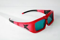 The recently introduced Omega 3D/Panavision 3D system also uses this technology, though with a wider spectrum and more "teeth" to the "comb" (5 for each eye in the Omega/Panavision system). The use of more spectral bands per eye eliminates the need to color process the image, required by the Dolby system. Evenly dividing the visible spectrum between the eyes gives the viewer a more relaxed "feel" as the light energy and color balance is nearly 50-50. Like the Dolby system, the Omega system can be used with white or silver screens. But it can be used with either film or digital projectors, unlike the Dolby filters that are only used on a digital system with a color correcting processor provided by Dolby. The Omega/Panavision system also claims that their glasses are cheaper to manufacture than those used by Dolby.[82] In June 2012 the Omega 3D/Panavision 3D system was discontinued by DPVO Theatrical, who marketed it on behalf of Panavision, citing "challenging global economic and 3D market conditions".[83] Although DPVO dissolved its business operations, Omega Optical continues promoting and selling 3D systems to non-theatrical markets. Omega Optical's 3D system contains projection filters and 3D glasses. In addition to the passive stereoscopic 3D system, Omega Optical has produced enhanced anaglyph 3D glasses. The Omega's red/cyan anaglyph glasses use complex metal oxide thin film coatings and high quality annealed glass optics.