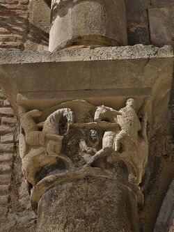 In a story modeled on David and Goliath,[3] Roland battles the Saracen giant Ferracutus, who is holding the city of Nájera (Spain ). A descendant of Goliath who had been sent to Nájera from Syria by the Emir of Babylon to fight the Christian army of Charlemagne, the giant Ferracutus didn't fear any arrow or spear and had the strength of forty strong men, was nearly twelve cubits tall, with a face a cubit long, a nose a hand long, members nearly four cubits long and fingers the length of three hands. Charlemagne sent several of his men to fight the giant: Ogier the Dane, Reinaldos of Montalbán, Constantine king of Rome, Count Hoel, and twenty other fighters two by two, who were defeated effortlessly by the giant and put to prison. As soon as Roland obtained permission from Charlemagne, he approached the giant alone and they fought for two days (taking truces to rest at night) using swords, wooden sticks, stones and bare fists. They accidentally killed each other's horses, but Roland could find no way of wounding the giant. During the second night, the courteous Roland placed a stone beneath the head of the giant as a pillow, and upon waking the giant revealed to Roland that he was only vulnerable in one spot: his navel. They also had a conversation about religion discussing matters such as the Holy Trinity, the Genesis, the Immaculate Conception and Resurrection of Jesus. After this conversation another fight took place in which Roland used the knowledge his opponent had given him, and killed Ferragut by inserting a spear in his navel.