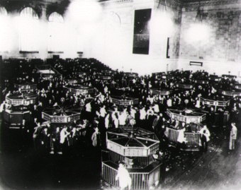 Selling intensified in mid-October. On October 24, "Black Thursday", the market lost 11% of its value at the opening bell on very heavy trading.[13] The huge volume meant that the report of prices on the ticker tape in brokerage offices around the nation was hours late, and so investors had no idea what most stocks were trading for.[14] Several leading Wall Street bankers met to find a solution to the panic and chaos on the trading floor.[15] The meeting included Thomas W. Lamont, acting head of Morgan Bank; Albert Wiggin, head of the Chase National Bank; and Charles E. Mitchell, president of the National City Bank of New York.[16] They chose Richard Whitney, vice president of the Exchange, to act on their behalf.
