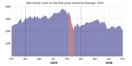 It was the most devastating stock market crash in the history of the United States, when taking into consideration the full extent and duration of its aftereffects.[1] The Great Crash is mostly associated with October 24, 1929, called Black Thursday, the day of the largest sell-off of shares in U.S. history,[2][3] and October 29, 1929, called Black Tuesday, when investors traded some 16 million shares on the New York Stock Exchange in a single day.[4] The crash, which followed the London Stock Exchange's crash of September, signaled the beginning of the Great Depression.