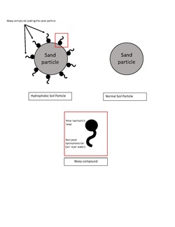 It was found that in a particular New Zealand sand, this waxy lipid coating consisted of primarily hydrocarbons and triglycerides that were basic in pH along with a lesser value of acidic long-chain fatty acids.[4] Capillary penetration amongst soil particles is limited by the hydrophobic coating on the particles, resulting in water repellence in each particle affected as the hydrophilic head of the lipid attaches itself to the sand particle leaving the hydrophobic tail shielding the outside of the particle.[2] This can be seen in Figure 1 below.
