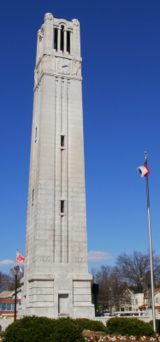 The Memorial Belltower, located in the Northeast corner of North Campus, serves as the signature of NC State and appears in the NC State Chancellor's Seal. It was constructed as a monument to alumni killed in World War I. The granite tower, completed in 1937, is 115 feet (35 m) tall. As a tradition, the Belltower is lit in red at night immediately following athletic victories and certain academic achievements.[30]