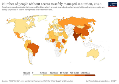 According to the UN-Water, in 2017 only 11% of the population used a safely managed drinking water service on their premises. Another 30% used a "basic service" (less than 30 minutes round trip for water collection), with the remainder having to rely on "limited service" (more than 30 minutes), "unimproved sources" (such as unprotected dug wells or springs) or surface water. Only 7% of the population used a safely managed sanitation service, 7% only had "limited service" (latrines shared with other households), 63% had to rely on "unimproved service" (e.g. a simple pit or a bucket) and 22% defecate in the open.[13]