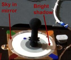 The ball is the nodus, the post is the gnomon.[3] The colors on the corners are for calibrating colors, and the inner circles are in greyscale.[3] There is a mirrored section on the middle circle to reflect the sky.[3]