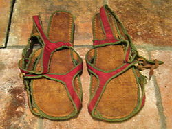 Sandals and stockings belong to the liturgical vestments supported by the evidence from the 5th and 6th centuries. Originally the sandals were called campagi and the stockings udones. The shoes were given the name 'sandalia' probably during the eighth to the 9th century, and this name was first applied to them in the North; the designation 'caligæ' for udones came into use in the 10th century, also in the North. The original form and material of the campagi was slippers that covered only the tip of the foot and the heel, and were likely fastened to the foot by straps. This slipper was made of black leather. The stockings were, very likely, made of linen, and were white in colour. In the earliest period the campagi and udones were by no means exclusively an episcopal vestment, as they were worn by deacons. This foot-covering was not reserved exclusively for the clergy, as they were worn as a mark of distinction by certain persons of rank, and were probably copied from the buskins of the ancient senators. Their use gradually became customary among the higher clergy, especially when these appeared in their full official capacity for the celebration of the Liturgy. During the eighth and ninth centuries also the Roman subdeacons and acolytes wore a distinctive foot-wear, the subtalares, which, however, were simpler than the campagi, and had no straps. The sandals and stockings became a specifically episcopal vestment about the 10th century. Apparently as early as the 12th century, or at least in the second half of the 13th century, they were no longer worn even by the cardinal deacons of Rome. The privilege of wearing the sandals and caligæ was first granted to an abbot in 757 by Pope Stephen III. This is, however, an isolated case, as it was only after the last quarter of the 10th century, and especially after the 12th century that it became customary to grant abbots this privilege.[1] The episcopal sandals are no longer normally seen in the Catholic Church, except for those liturgical ceremonies celebrated according to pre-Vatican II rubrics.