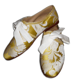 Unlike the ancient sandals, which consisted merely of soles fastened to the foot by straps, episcopal sandals are in the form of low shoes, and resemble slippers. The sole is of leather; the upper part, generally ornamented with embroidery, is made of silk or velvet. No cross is required upon the sandals; at Rome this is an exclusively papal privilege. The privilege of wearing the sandals and caligæ (liturgical stockings) belongs only to bishops. They may be worn by abbots and other prelates only by special privilege from the pope and only so far as this privilege grants. Pontifical footwear is used only at Tridentine Pontifical Solemn Mass and at functions performed during the same, such as ordination, but not on other occasions, as, for example, Confirmation, Solemn Vespers, etc. It is therefore in the most exact sense of the word a vestment worn during the Mass. The liturgical color for the day decides the colour of the sandals and stockings; there are, however, no black stockings or sandals, as the bishop does not make use of either of these pontifical footwear at Requiem Masses.[1]